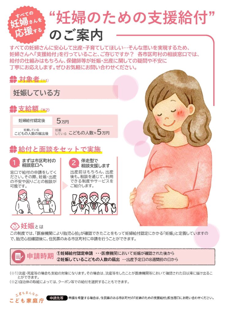 妊婦のための支援給付のご案内 2025年5月17日 トピックス・インフォメーション 妊娠されている方を対象に支援給付金が支給されることになりました。申請を希望する場合は、住民票のある市区町村の「妊婦のための支援給付」担当窓口にお問い合わせください。
